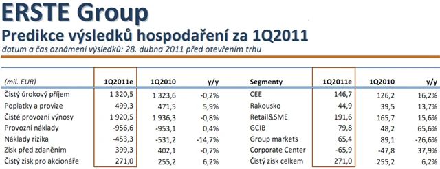 Erste ve čtvrtek představí výsledky za 1Q2011, které podle naší projekce budou pokračovat v trendu druhé části minulého roku. Konkrétně tedy očekáváme stále poměrně slabá čísla na úrovni provozních výnosů (-0,8 % y/y), která budou nicméně kompenzována dalším poklesem nákladů rizika a dobrou kontrolou provozních nákladů. To by mělo plně vykompenzovat vyšší ztrátu na úrovni ostatního výsledku, zapříčiněnou mimo jiné zavedením bankovní daně v Rakousku.