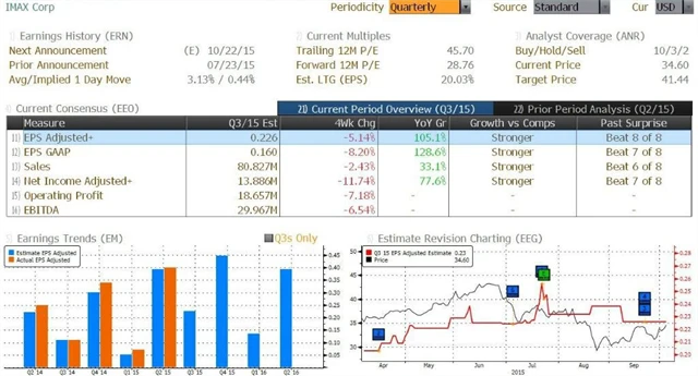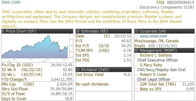 IMAX Corporation je jednou z největších světových technologických společností ze sektoru zábavy, která se specializuje na unikátní filmové technologie. Společnost ke konci roku 2014 disponovala sítí 934 kin a působila v 62 zemích světa. Navíc měla kontrakty na minimálně 118 nových kin. K dalším tržbám by jí mohly pomoci filmové trháky jako Hvězdné války: Síla se probouzí nebo The Hunger Games: Síla vzdoru 2. část.