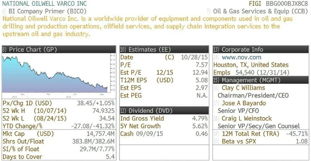 National Oilwell Varco je světovým lídrem v projektování, výrobě a prodeji zařízení a součástek využívaných při těžbě a prodeji ropy a zemního plynu. Podobně jako zbytek odvětví byly jeho akcie silně postiženy výprodeji (klesly o více než 50 %). Může se pochlubit zdravou rozvahou a pozicí tržního lídra. Téměř u každého produktu je jedničkou nebo dvojkou na trhu (podle velikosti tržního podílu).