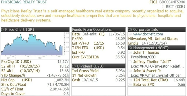 Physicians Realty Trust, realitní fond zaměřený na sektor zdravotní péče, si klade za cíl nákup, rozvoj a správu budov zdravotnických zařízení, které jsou pronajímány lékařům, nemocnicím a dalším poskytovatelům zdravotní péče. V současnosti vlastní 122 budov a 94,6 % z nich má pronajatých.