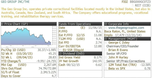 Geo Group je přední světový REIT specializující se na detenční a další zařízení podobného typu v USA, Spojeném království, Austrálii a JAR. Je to první plně integrovaný REIT s takovýmto zaměřením. Je velice citlivý na novinové titulky a politická rozhodnutí, ale výše dividendy je hodně přesvědčivým argumentem, proč si trochu zariskovat.