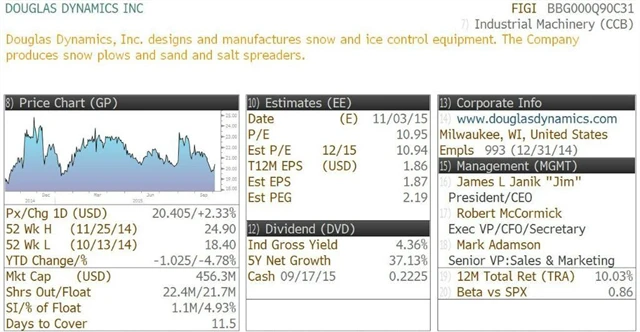 Douglas Dynamics, výrobce sněžných pluhů, má sice sezónní byznys, nicméně valuace a dividendový výnos (4,2 %) z firmy dělají skvělou dlouhodobou investici. Firma má čistě americký byznys, takže by ji nijak neměl ohrozit silný dolar nebo ekonomické problémy ve zbytku světa.