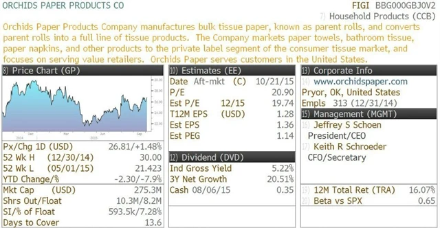Orchids Paper Products je dobrou volbou, pokud hledáte vysoký výnos a konzistentní výkonnost v odvětví rychloobrátkového zboží. Firma vyrábí papírové utěrky a kapesníčky. Společnost se pravidelně objevuje na seznamu Forbes Best Small Companies díky svému dlouhodobému růstu a ziskovosti. Letos se očekává růst příjmů o 18,8 % na 169,6 milionu USD a zisků na akcii o 21 % na 1,34 USD.
