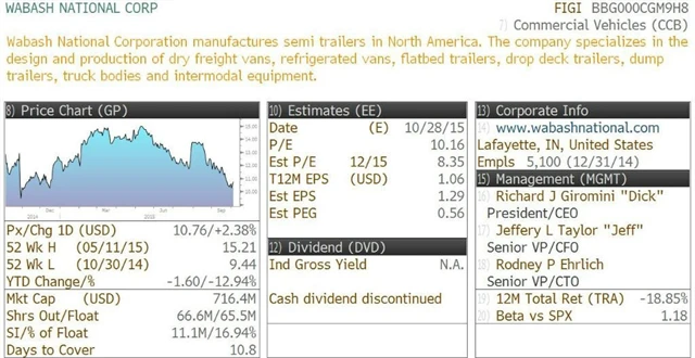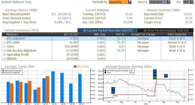 Očekává se, že produkce v roce 2015 stoupne o 14 %, zejména díky silné poptávce. V srpnu společnost potvrdila svůj celoroční výhled, který byl zvýšen o měsíc dříve. Střed pásma pro očekávaný zisk je 1,30 USD, implikovalo by to 46% růst. Pokud Wabash naplní zisková očekávání, mělo by se jeho P/E, aktuálně kolem 12, zvýšit na pětiletou mediánovou hodnotu 16.