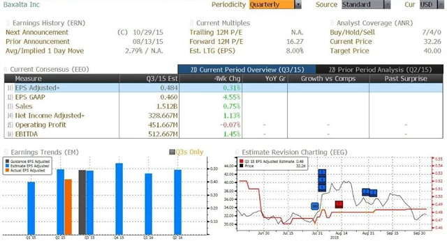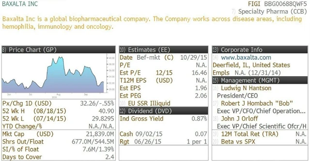 Baxalta, odštěpená od Baxter International, vyrábí a prodává produkty pro léčení hematologických a imunologických chorob včetně hemofilie. Společnost již během svého krátkého života upoutala pozornost jiné biofarmaceutické firmy. Shire, irská společnost, nedávno zveřejnila nabídku na převzetí Baxalty za necelých 45 USD za akcii. Baxalta hodnotí nabídku jako nepřiměřeně nízkou, takže bude Shire nejspíše muset přihodit, pokud se má obchod uskutečnit.