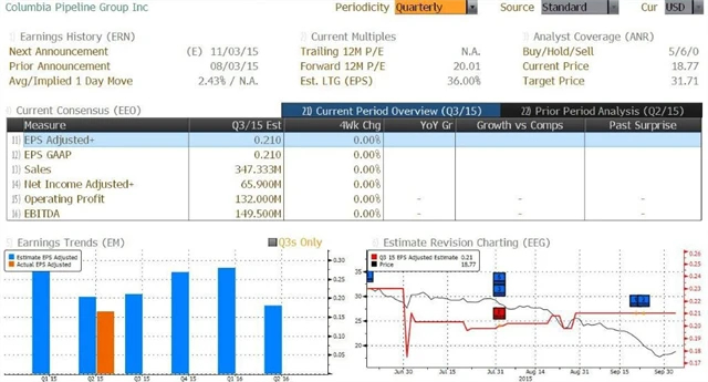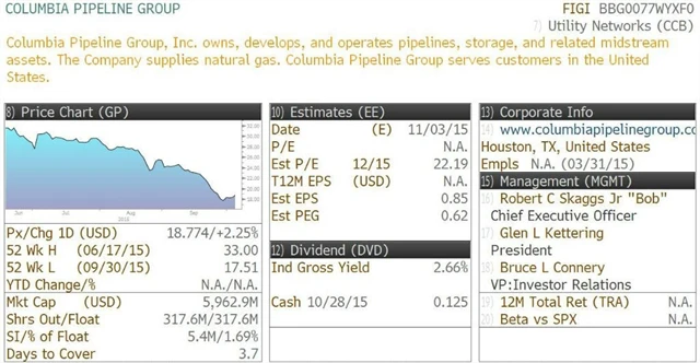 Columbia Pipeline Group, odštěpená společnost od síťové firmy NiSource, vlastní a provozuje desítky tisíc kilometrů mezistátních plynovodů od New Yorku po Mexický záliv. Columbia taktéž disponuje jedním z největších amerických podzemních systémů skladování zemního plynu. Od počátku obchodování s akciemi začátkem června jejich kurz klesá. V současnosti nabízejí dividendový výnos kolem 1,9 %.