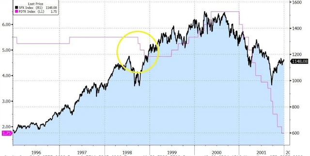 Býčí trh a expanze tažená americkou ekonomikou byla náhle přerušena (jako dnes) problémy mladých trhů. Jakmile asijská finanční krize mezi lety 1997 a 1998 začala zasahovat i takzvanou Main Street v USA, tedy spotřebitele, globální lídři na ni odpověděli uvolněním měnové politiky. Fed byl po mírném zvýšení sazeb v roce 1998 nucen obrátit kurz měnové politiky a úrok snížil téměř o procentní bod (žluté kolečko na grafu). Tím ale přikrmil finální akciovou rally a odstartoval poslední fázi technologické bubliny.