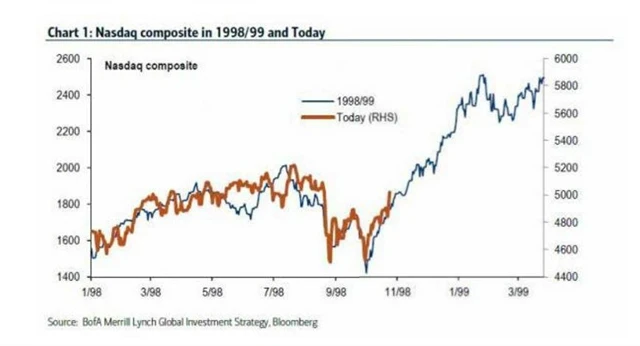 Graf z dílny Bank of America Merrill Lynch ilustruje současný růst Nasdaqu ve vztahu k pohybům stejného indexu mezi lety 1998 a 1999.