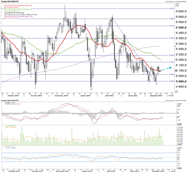Akcie Komerční banky již poněkolikáté našly podporu na psychologické úrovni 5 000 Kč. MACD překonala spouštěcí linii a vydala nákupní signál. Objemy obchodů stagnují. RSI se zespodu přibližuje k hranici 50 bodů.