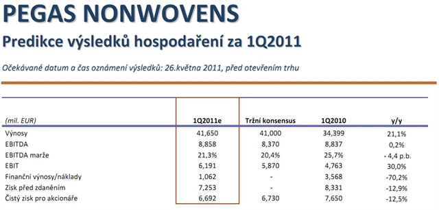 Při odhadované daňové povinnosti 560 tisíc EUR činí náš odhad čistého zisku Pegas Nonwovens za 1Q 2011 celkem 6,69 milionu EUR (-12,5 % y/y).