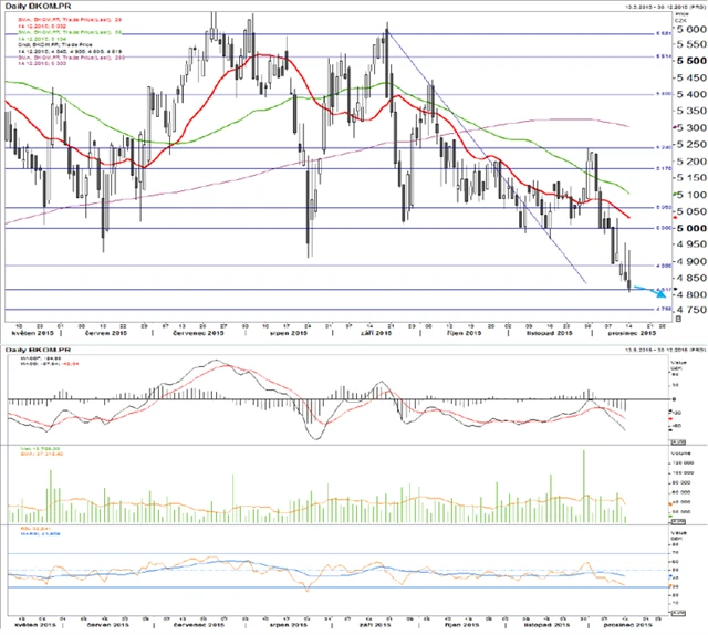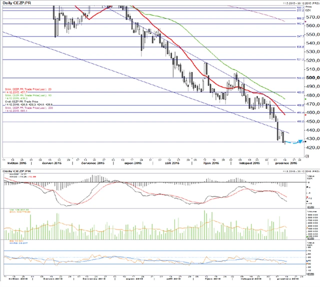 Technická analýza cen akcií ČEZ a Komerční banky. (15. 12. 2015)