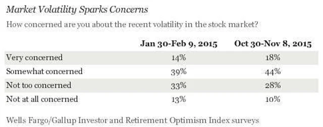 Téměř pětina investorů (18 %) aktuálně tvrdí, že se volatility obává "velmi", a 44 % investorů vyjadřuje "jisté obavy". Zbytek tvrdí, že se volatility obává jen málo nebo vůbec. Na začátku roku 2015 přitom velké obavy vyjadřovalo jen 14 % a jisté obavy 39 % investorů. Spolu s tím taktéž mírně klesá počet investorů, kteří věří, že je příhodný čas pro investování. Aktuálně jich tento názor zastává 54 %, v únoru 2015 to bylo 58 %.