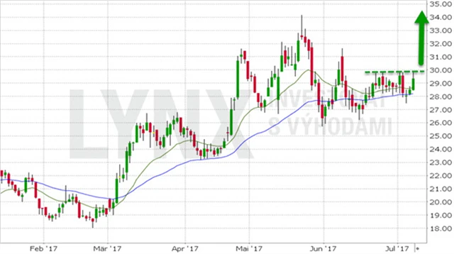 Jako vhodný nákupní signál se jeví proražení rezistence na 30 USD. Po něm spekulujeme na rychlejší pohyb ceny vzhůru, a proto ani nebudeme fixně zadávat cílovou cenu. Stop-loss ale vzhledem k charakteru titulu je potřeba nastavit a striktně jej dodržet na 27,44 USD.