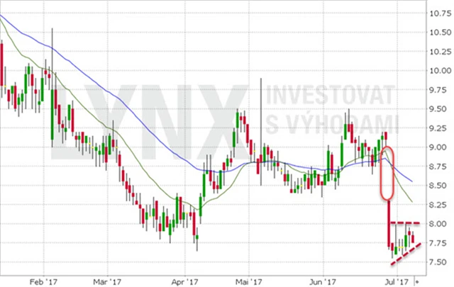 Aktuální formace medvědí vlajky je příležitostí pro načasování SHORT sázky. Při proražení spodní hrany na 7,63 USD vstupujeme do krátké pozice a spekulujeme na pokles až k 6,40 USD. Stop-loss pokládáme na maximum aktuálního rozpětí na 8,05 USD.