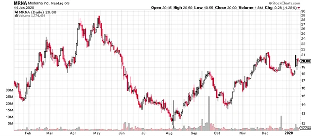 Biotechnologická firma přitahuje pozornost analytiků na Wall Street svým novým přístupem k využívání takzvané mediátorové RNA (mRNA) při léčení, respektive prevenci chorob. První fáze testování vypadají slibně. A stejně tak očekávání analytiků a jimi stanovené cílové ceny pro rok 2020 (24,40 USD, rozmezí od 24 do 40 USD, průměr 30,25 % při současné ceně 20 USD).