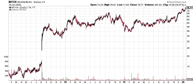 Výrobce léků pro pacienty se závažnými kardiovaskulárními onemocněními má ve druhé fázi testování lék mavacamten, který by měl pomoci s léčbou neobstrukční hypertrofické kardiomyopatie. U pěti testovaných pacientů se sice objevily určité problémy, ale i tak jsou akcie firmy favority investorů i analytiků, kteří oceňují "přesvědčivý příběh". V případě úspěchu léku by cena akcie (nyní 76,77 USD) mohla letět nahoru, což se projevuje na většině cílových cen (73 až 95 USD, průměr 82,5 USD).