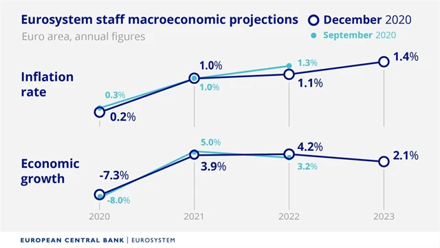 V prosincové prognóze banka potvrdila výhled inflace pro rok 2021, zhoršila ovšem výhled vývoje HDP. Inflace podle banky letos v eurozóně stoupne na procento, v roce 2022 se zvýší na 1,1 % (září: 1,3 %) a v roce 2023 pak dosáhne 1,4 %. HDP eurozóny by letos měl vzrůst o 3,9 % (září: +5 %), v roce 2022 by měla ekonomika zpevnit o 4,2 % (září: +3,2 %) a v roce 2023 by měla přidat 2,1 %.
