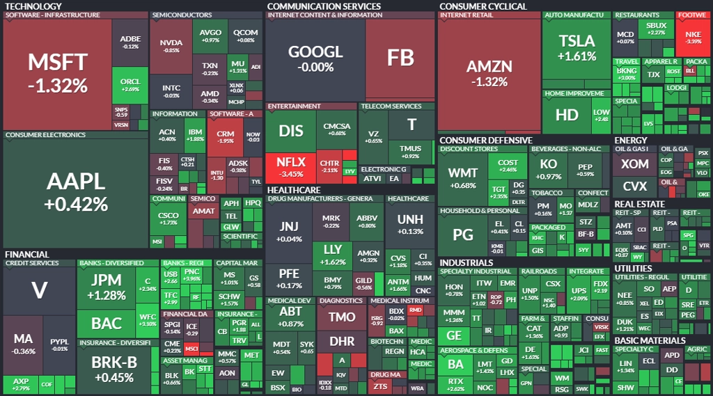 Index Dow stoupl o 0,62 % na 32 619,48 bodu, širší index S&P 500 vzrostl o 0,52 % na 3 909,52 bodu a index technologického trhu Nasdaq Composite se zvýšil o 0,12 % na 12 977,68 bodu. Index volatility VIX spadl o 6,56 % na 19,81 bodu a výnos 10letých vládních dluhopisů USA se zvýšil o dva bazické body na 1,633 %.