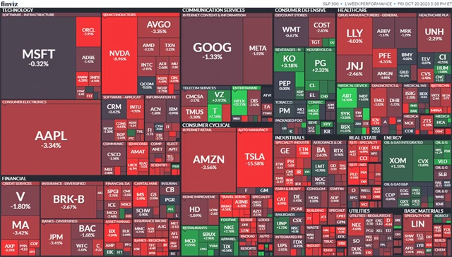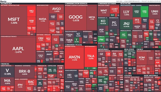 Kleslo všech 11 sektorů indexu S&P 500. Investoři se obávají dalšího zvyšování úrokových sazeb americkou centrální bankou a rozšíření konfliktu mezi Izraelem a palestinským radikálním hnutím Hamás. Index regionálních bank KBW prudce spadl. "Celý tento sektor je pod tlakem kvůli vyšším sazbám," řekl Alan Lancz ze společnosti Alan B. Lancz & Associates. Investoři budou o víkendu pravděpodobně pozorně sledovat události na Blízkém východě, uvedl dále.