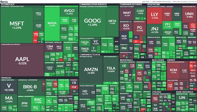 Americké akcie v pátek posílily a připsaly si výrazné zisky i v rámci celého týdne. Cenné papíry se vezly na vlně optimismu po zveřejnění makroekonomických údajů. Data z amerického trhu práce podporují naději, že zvyšování úrokových sazeb Fedu je již u konce. Většina sektorů v páteční seanci vykazovala zisky, jednou z mála výjimek byly cenné papíry z odvětví ropy a zemního plynu.
