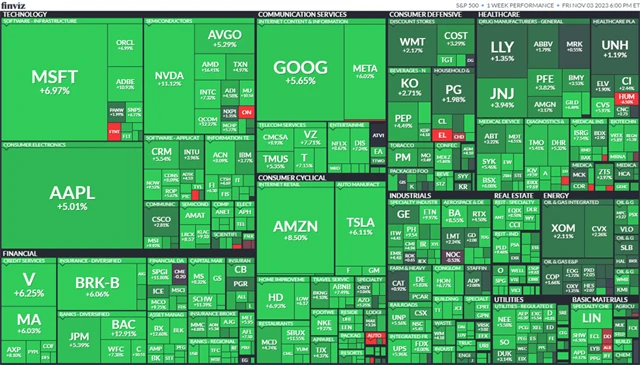 Za celý týden index Dow vzrostl o 5,07 %, S&P 500 posílil o 5,85 % a Nasdaq Composite zakončil se ziskem 6,61 %. Strmý růst cen akcií byl podpořen mimo jiné středečním rozhodnutím Fedu držet úrokové sazby beze změny na stabilní úrovni (podruhé za sebou) v pásmu 5,25-5,50 %, tedy na nejvyšší úrovni od roku 2001.