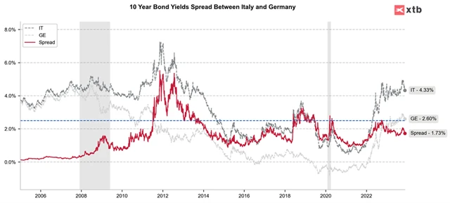 Reakce trhu na tyto aktualizace byla pozitivní, s výrazným poklesem rizikové prémie u italských i portugalských dluhů. Rozdíl ve výnosech mezi 10letými italskými a německými dluhopisy, který je ukazatelem vnímaného rizika, klesl na dvouměsíční minimum, což ilustruje zvýšenou důvěru trhu v italský dluh. Mírně poklesl i spread mezi portugalskými a německými dluhopisy.