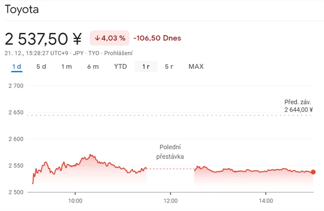 Akcie japonské automobilky Toyota ve čtvrtek klesly o 4 %. K prudkému poklesu došlo poté, co Toyota oznámila stažení přibližně milionu vozidel. Bezpečnostní svolávání aut se týká některých modelů Toyota a Lexus z let 2020 až 2022 ve Spojených státech.