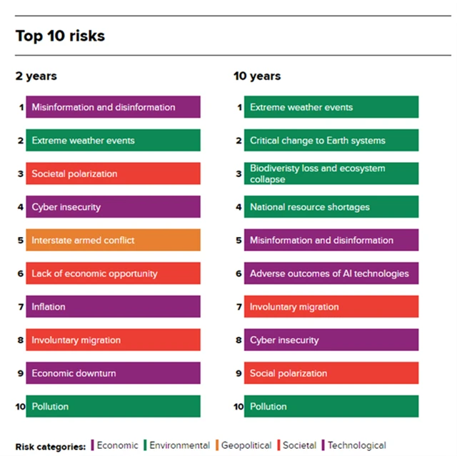 Jako nejpravděpodobnější rizika v příštích deseti letech byly jmenovány extrémní povětrnostní jevy, kritické změny zemských systémů, ztráta biologické rozmanitosti a kolaps ekosystémů, nedostatek přírodních zdrojů a dezinformace. Nepříznivé důsledky technologií umělé inteligence byly rovněž jmenovány jako dlouhodobější možné riziko.