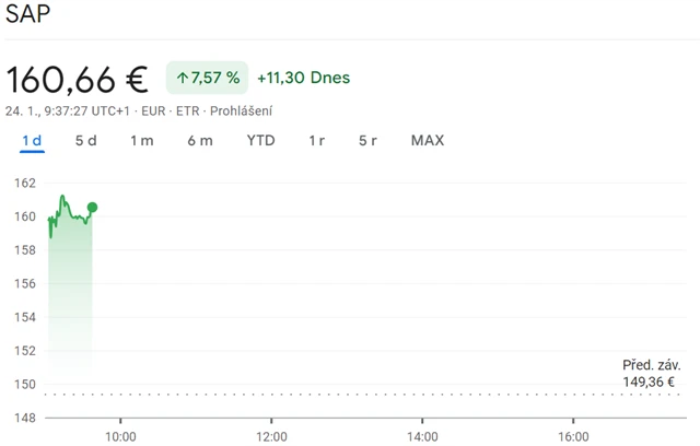 V 9.20 se akcie německé společnosti obchodovaly o 7,2 % výše na úrovni 160,06 eura. Od začátku roku akcie SAP vzrostly přibližně o 15 %.