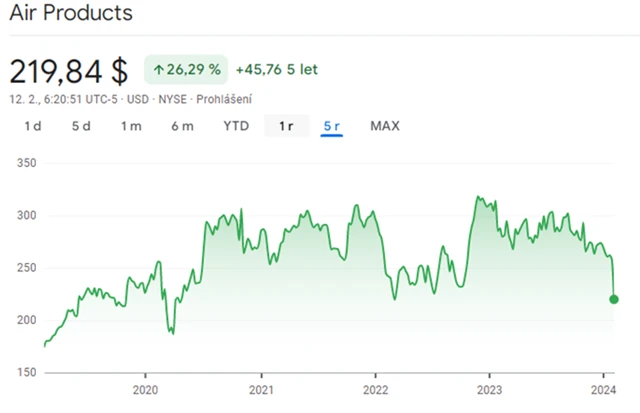 Společnost Air Products nyní očekává celoroční upravený zisk na akcii 12,20 až 12,50 USD, což je o šest až devět procent více než v předchozím roce. Za poslední rok cenné papíry firmy ztrácejí přes 23 %, v posledních pěti letech ale vykazují zhodnocení o více než 26 %.