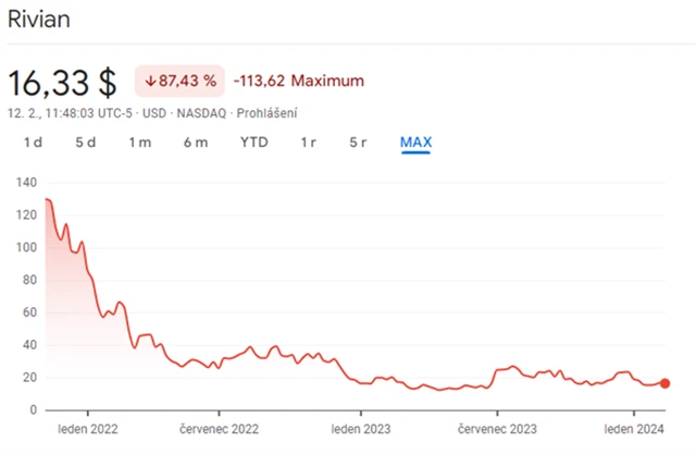 Od svého uvedení na burzu v listopadu 2021 ztrácejí cenné papíry Rivian k dnešnímu dni více než 87 %.