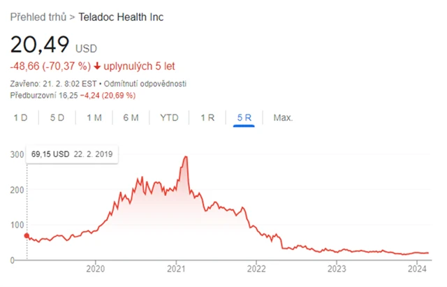 Cenné papíry Teladoc v předobchodní fázi úterní seance ztrácejí přes 20 %. Za posledních 5 let odepisují přes 70 % hodnoty.