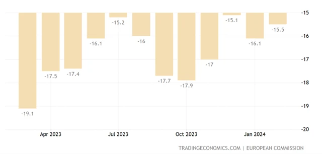 Index ekonomické nálady v eurozóně sestavovaný Evropskou komisí v únoru klesl na 95,4 bodu z lednových 96,1 bodů. Index důvěry v průmyslu se snížil na -9,5 bodu (leden: -9,3 bodu revidováno z -9,4 bodu) a index důvěry ve službách klesl na 6 bodů (leden: 8,4 bodu revidováno z 8,8 bodu). Index spotřebitelské důvěry vzrostl na -15,5 bodu z lednových -16,1 bodu.