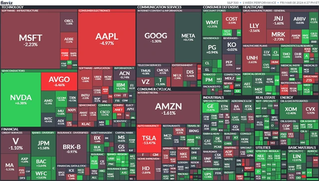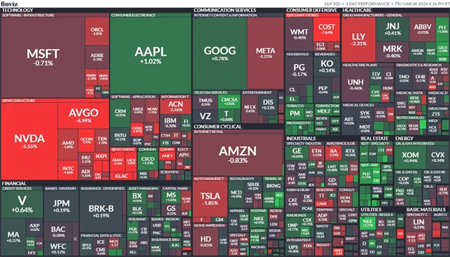 Akciové indexy táhly dolů cenné papíry Nvidie, které v páteční seanci ztratily dech. Miláček odvětví umělé inteligence zakončil nejhorší obchodní den od konce května propadem o více než 5 %. Navzdory tomuto oddechu akcie Nvidie za celý týden i tak posílily o více než 6 %. "Neznamená to, že by potenciál dlouhodobého růstu skončil," řekl Sam Stovall, hlavní investiční stratég ve společnosti CFRA Research, o pátečním výkonu Nvidie. "Jen to říká, že jsme možná předběhli sami sebe. Dostali jsme se do situace překoupenosti a je čas vybrat nějaké zisky," dodal. Jen letos tržní kapitalizace společnosti narostla o více než bilion dolarů.