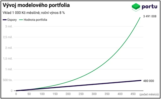 - Během 40 let (480 měsíců) nakumuluje portfolio vklady v hodnotě 480 000 Kč, konečná hodnota ale dosáhne 3 491 008 korun. Výsledkem je tak výnos 3 011 008 korun, což představuje návratnost 627 %.