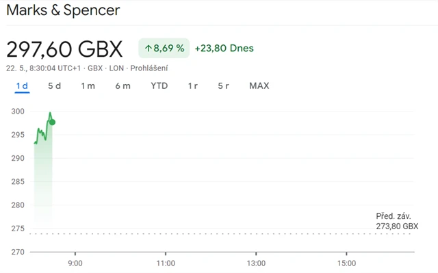 Britská maloobchodní společnost Marks & Spencer (M&S) v uplynulém finančním roce zvýšila zisk před zdaněním a úpravou jednorázových položek o 58 procent na 716,4 milionu liber (20,8 miliardy Kč). Výsledky překonaly očekávání analytiků díky reorganizaci, která podpořila růst tržeb v divizích potravin i oděvů. S dalším růstem počítá firma i v aktuálním roce, vyplývá z výsledkové zprávy. Akcie společnosti reagovaly růstem o více než 8 %.