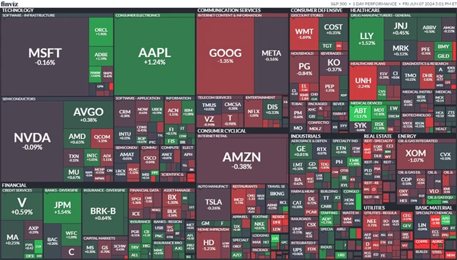 Index Dow v pátek odepsal 0,22 % na 38 798,99 bodu, širší S&P 500 oslabil o 0,11 % na 5 346,99 bodu a index technologického trhu Nasdaq Composite zaznamenal ztrátu 0,23 % na 17 133,13 bodu. Index volatility VIX se snížil o 2,86 % na 12,22 bodu a výnos 10letých vládních dluhopisů USA vzrostl o patnáct bazických bodů na 4,434 %. Cena ropy klesla o půl procenta, zlato odepsalo 3,5 % a stříbro zlevnilo o 7 %. Bitcoin během pátku atakoval cenu 72 000 USD, během odpoledne SELČ ale korigoval téměř o 5 % a na konci dne se obchodoval kolem 69 000 USD.