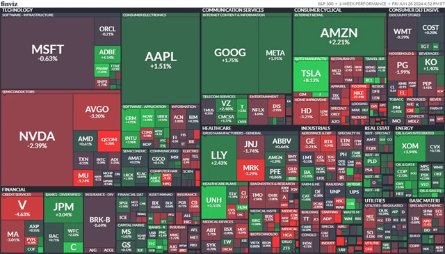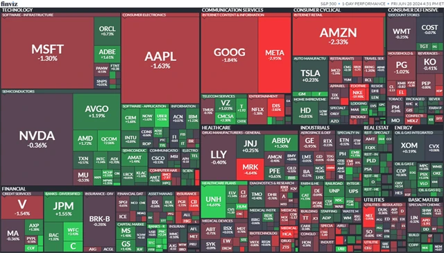 Akcie ve Spojených státech v pátek uzavřely v červených číslech, když se nedařilo technologickému sektoru. Investoři vyhodnocovali nejnovější údaje o inflaci a snažili se odhadnout, kdy by americká centrální banka mohla začít snižovat úrokové sazby. Trh oficiálně uzavřel prvních šest měsíců letošního roku, které se nesly ve znamení výrazného růstu odvětví umělé inteligence. Dolar v pátek oslabil.