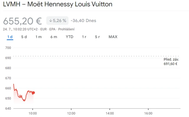 Čtvrtletní tržby francouzského luxusního koncernu LVMH dosáhly ve druhém čtvrtletí 20,98 miliardy eur, zatímco analytici LSEG očekávali 21,6 miliardy eur. Akcie společnosti v 9:04 londýnského času odepisovaly 5,3 %. Ostatní akcie luxusního sektoru, včetně společnosti Kering, vlastníka Gucci, rovněž oslabily.