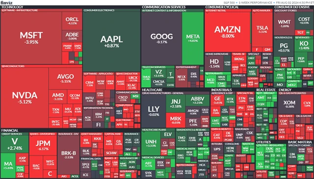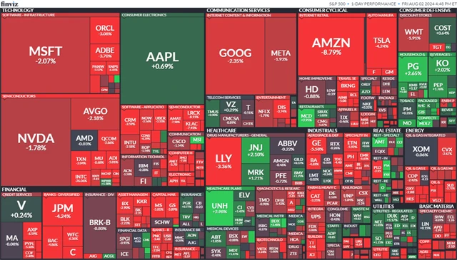 Americké akcie v závěru týdne výrazně oslabily pod vlivem pátečních dat z trhu práce. Nejprudší poklesy zaznamenalo technologické odvětví. Zpráva o vývoji nezaměstnanosti vyvolala u investorů obavy z možné recese. Index Nasdaq Composite již klesl o více než 10 % ze svého červencového maxima, čímž se dostal do korekce. Z jedenácti hlavních sektorů indexu S&P 500 posílilo v páteční seanci pouze odvětví základního spotřebního zboží.