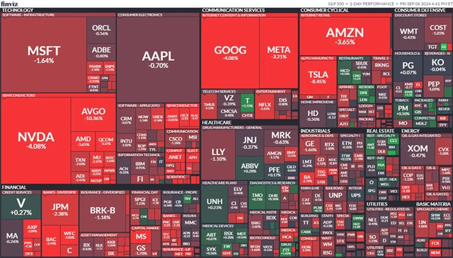 V páteční seanci se nedařilo těžkým vahám v technologickém sektoru. Investoři dávali ruce pryč od rizikovějších cenných papírů z důvodu obav o kondici americké ekonomiky, což se projevilo například v ceně akcií společností Amazon (-3,65 %), Alphabet (-4,02 %), Meta Platforms (-3,21 %), NVIDIA (-4,09 %), Tesla (-8,45 %) či Broadcom (-10,36 %).