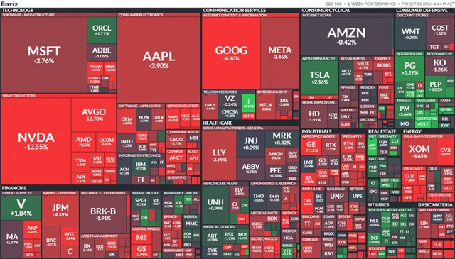 Americké akcie v závěru týdne oslabily, když se nedařilo mimo jiné cenným papírům z technologického odvětví. Index S&P 500 má za sebou nejhorší týden od března 2023. V jeho závěru investoři vyhodnocovali nejnovější data z amerického trhu práce. Nasdaq pak zaznamenal nejhorší týden od roku 2022, páteční seanci zakončil více než 10 % pod svým historickým maximem.