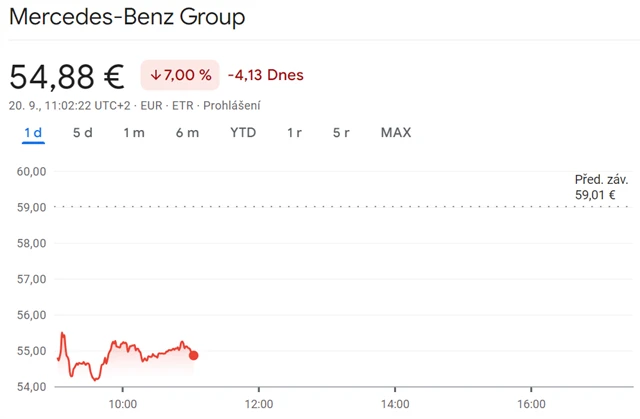 Akcie Mercedes-Benz Group během pátečního dopoledne odepisovaly až 8 %, následně část ztrát smazaly.