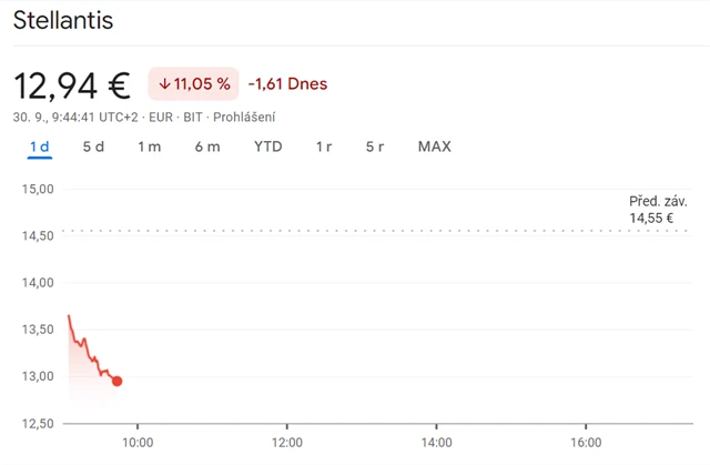 Akcie automobilky se v 9.40 londýnského času obchodovaly se ztrátou více než 11 %.