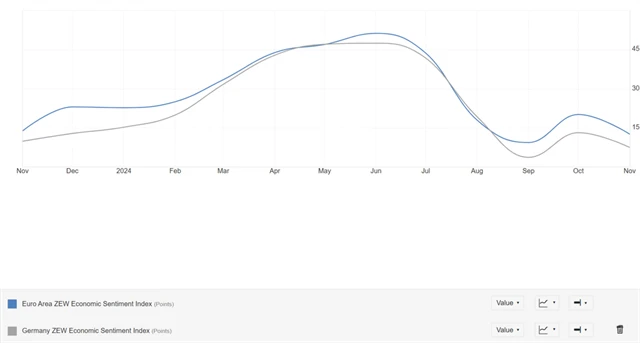 Důvěra investorů v německou ekonomiku se v listopadu znovu zhoršila více, než se čekalo. Německý ekonomický institutu ZEW v úterý uvedl, že jeho index důvěry se snížil na 7,4 bodu z říjnových 13,1 bodu. Výsledky jsou horší než odhady analytiků, kteří v anketě agentury Reuters očekávali pokles indexu na 13 bodů. Hůře investoři opět hodnotí i současnou situaci. Snížila se i důvěra v ekonomiku celé eurozóny, a to na 12,5 bodu z říjnových 20,1 bodu při očekávání růstu na 20,5 bodu.