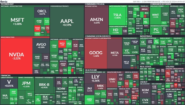 Investoři podle posledních průzkumů zmírnili očekávání snižování úrokových sazeb centrální bankou USA. V současnosti dávají tomu, že Fed sníží v prosinci úroky o čtvrt procentního bodu, šanci 59,6 %. Ve hře je i to, že Fed v prosinci ponechá úroky beze změny. Trhy se snaží zhodnotit možný dopad očekávaných kroků nového amerického prezidenta na ekonomiku.