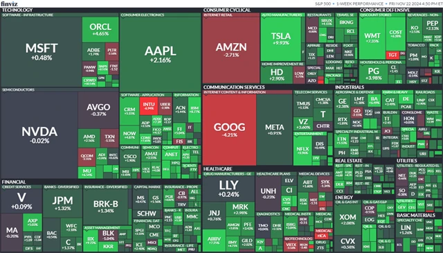 Akcie v USA v pátek i za celý týden posílily. V centru pozornosti obchodníků byly geopolitický vývoj a možný další vývoj úrokových sazeb. Investoři přesouvali peníze z technologických akcií do cyklických sektorů. Bitcoin se těsně přiblížil k ceně 100 000 USD.