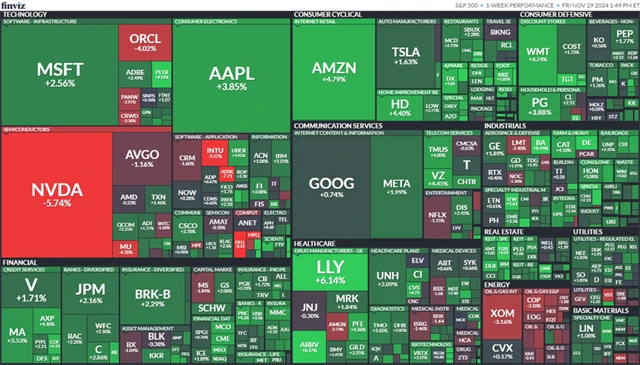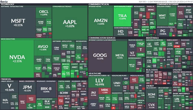 Poměrně široký růst posunul index S&P 500 do zatím neprobádaných výšin. Zhruba tři z pěti akcií z indexu S&P 500 uzavřely obchodní seanci v zelených číslech. Investoři tak završili úspěšný týden i měsíc. Listopadové obchodování se z velké části odehrálo v duchu povolební rally, která následovala po vítězství Donalda Trumpa. Republikáni také získali většinu v obou komorách Kongresu. Investoři očekávají, že Trumpova politika zaměřená na podporu podnikání by mohla posílit hospodářský růst a zisky firem. Objevují se ale také obavy, že může podpořit inflaci, zpomalit tempo snižování úrokových sazeb a zatížit globální růst.