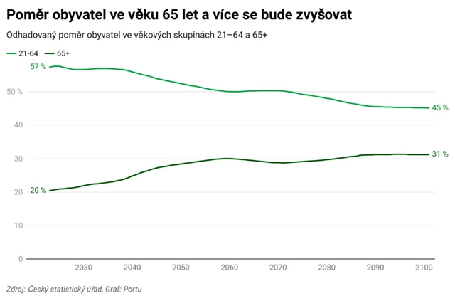 Podle odhadů ČSÚ bude lidí v seniorském věku poměrově neustále přibývat a v současném nastavení je český penzijní systém jen těžko udržitelný. V roce 2023 připadalo na jednoho občana staršího 65 let 2,8 lidí ve věku 21-64 let, v roce 2100 se toto číslo sníží na polovinu, tedy 1,4 produktivního člověka na jednoho seniora.