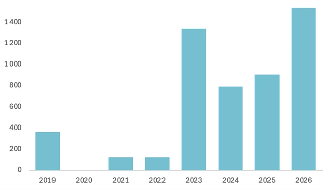 Graf: Počet dokončených bytů v BTR projektech (2019–2026)